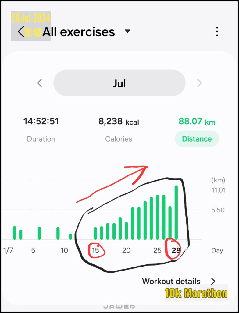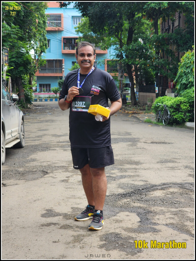 I started preparing for the run around two weeks before. The run was scheduled for 28th July and I started with the 2.5 km run on 15th July. As you can see in the image on the right, I ramped up gradually till I was doing 8.5 kms on 26th July. The day before the run was a rest and recuperation day so I did a slow run of 5 Kms on 27th. And then I ran the full 10 km on 28th. My run time was 1 hr and 33 mins. I was targetting a sub-90 min run but could not. I will try for that timing in my next run.